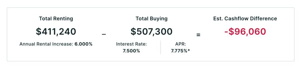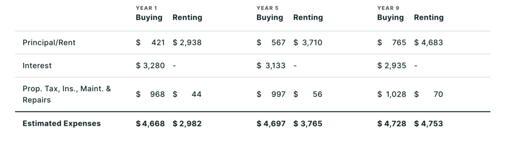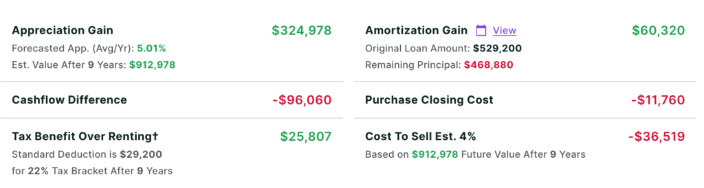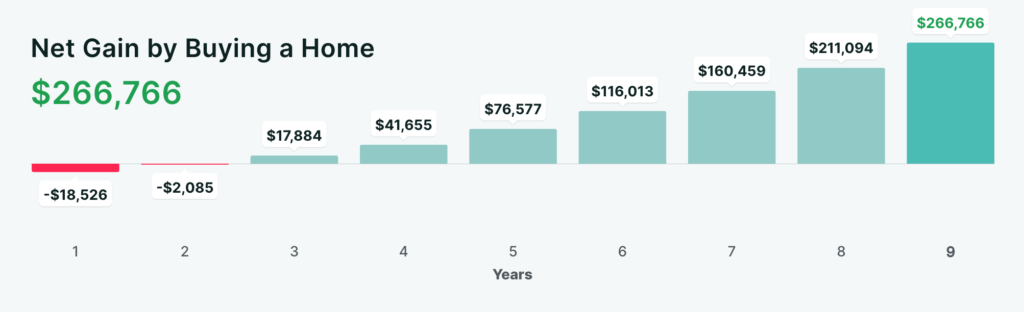 While the upfront costs and ongoing expenses of buying are higher, the equity built and the potential for property value appreciation significantly offset these costs. After nine years, you could potentially gain $324,362 in equity from the appreciation of your home, plus the equity built from your mortgage payments.