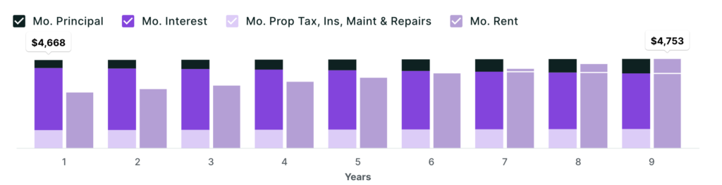 For example, with a purchase price of $588,000 and a standard 30-year fixed-rate mortgage at an interest rate of around 6.5% (assuming today’s rates), your monthly payment, including principal, interest, property taxes, and insurance, would be approximately $4,200. Over nine years, you’d pay around $453,600 in mortgage payments, of which $126,300 would go toward your principal, meaning you’d have that much equity in your home.